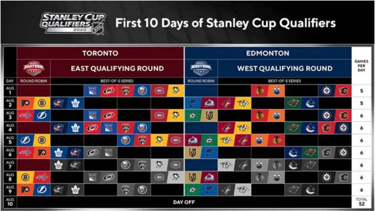 The East’s best-of-five qualifying series include No. 5 Pittsburgh vs. No. 12 Montreal, No. 6 Carolina vs. No. 11 New York Rangers, No. 7 New York Islanders vs. No. 10 Florida and No. 8 Toronto vs. No. 9 Columbus. In the West, the matchups are No. 5 Edmonton vs. No. 12 Chicago, No. 6 Nashville vs. No. 11 Arizona, No. 7 Vancouver vs. No. 10 Minnesota and No. 8 Calgary vs. No. 9 Winnipeg.