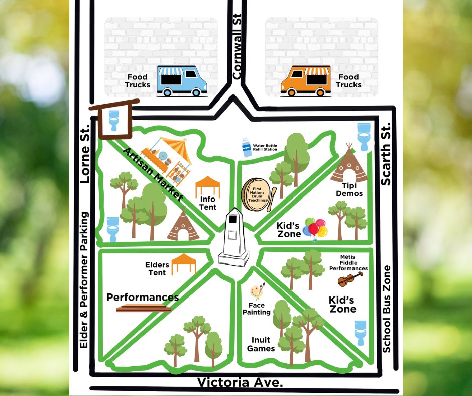 Portable washrooms will be available on site for your convenience. Additionally, an accessible washroom equipped with a change table can be found in the northwest corner of the park, and there are facilities inside the Regina Public Library.