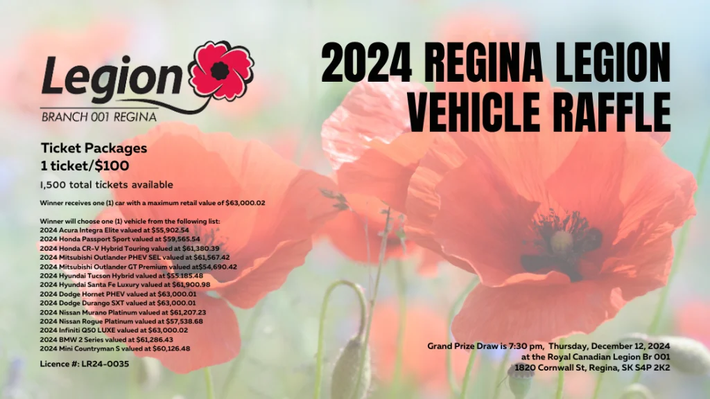 And if becoming a member isn’t your thing, how about this purchasing a $100 ticket for the 2024 Regina Legion Vehicle Raffle! The draw for the Vehicle of Your Choice happens on Thursday, December 12th at the Legion’s 1820 Cornwall Street, Regina. location. If you happen to be downtown check into the Branch, get your ticket there, and then take a tour, have a chat. And just maybe we will see you at the October 24th meeting.