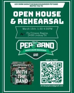 If you play a brass instrument, woodwind, or percussion and are over the age of 19, plus can read music, the 620 CKRM Saskatchewan Roughrider Pep Band is looking for you. They will gather on March 15th at Fly Fitness in Regina. Bring your instrument and get ready to play away, find out what the schedule and commitment is all about. Speaking from first hand experience, you can’t find a more dedicated group of musicians that make every appearance a special one.