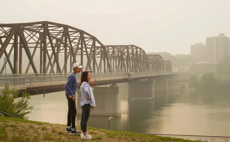 The Canadian Press Jul 22, 2025 Two people stand as the South Saskatchewan River is enveloped by forest fire smoke in Saskatoon, on Sunday, Sept. 3, 2023. Saskatchewan public safety officials say they are anticipating an average wildfire season with a cooler spring and hotter summer. THE CANADIAN PRESS/Heywood Yu